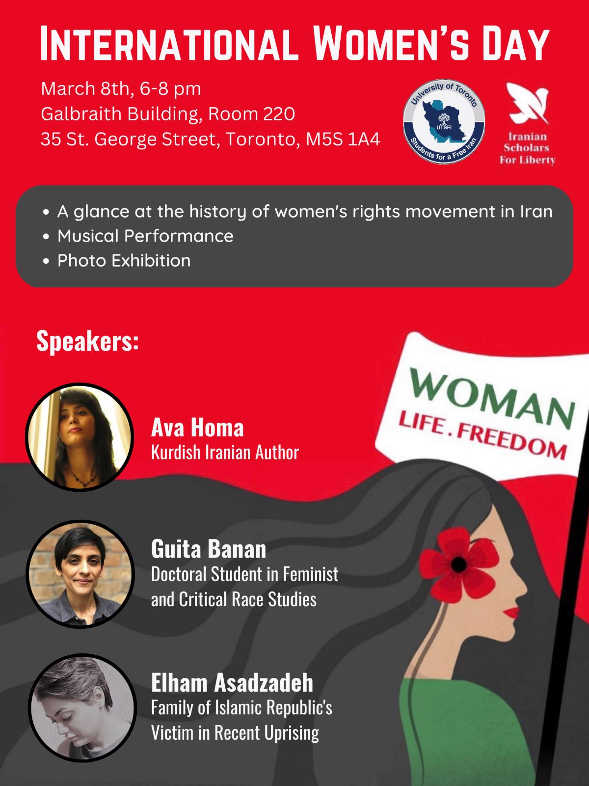 Join us on Wednesday, March 8th, 6:00-8:00 PM on International Women’s Day, in collaboration with Iranian Scholars for Liberty. We will gather in Galbraith Building, Room 220.