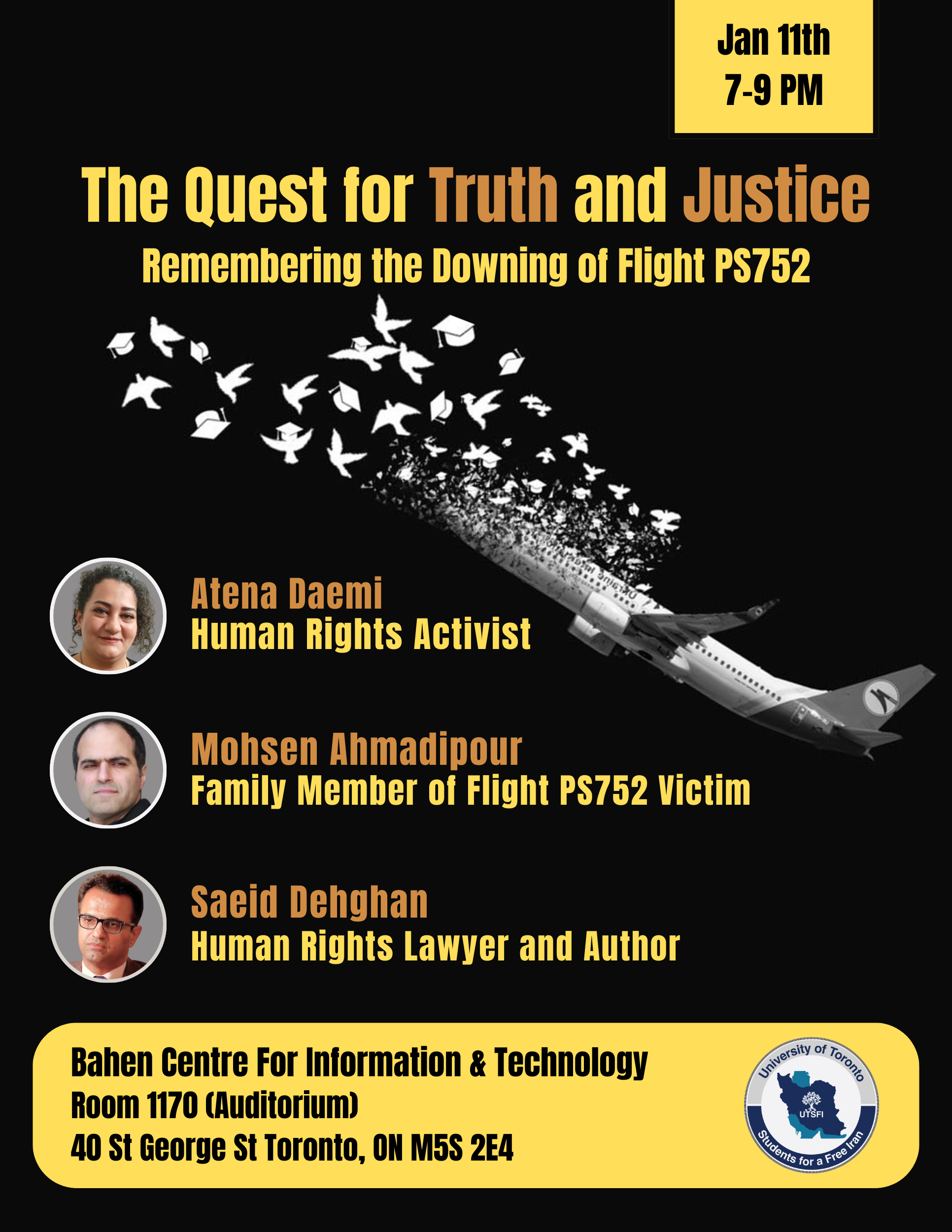 Join us on January 11th at 7 pm to remember the lives lost in the downing of the flight PS752. The Ukrainian passenger plane PS752 was shot down in January 2020 by the Islamic Revolutionary Guard Corps, resulting in the death of its 176 innocent passengers. Many of the victims were headed for Canada, and eight UofT students and community members were among them.